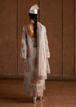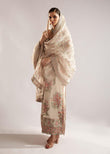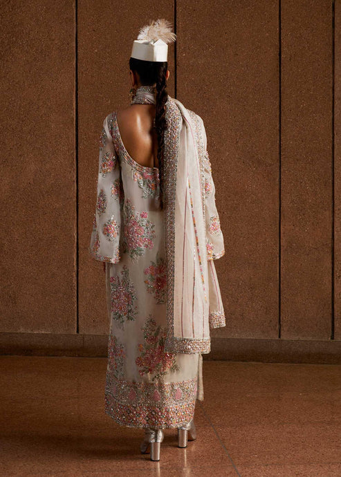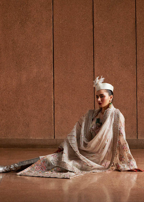 Evoking vintage glamour, Halina reimagines the classic pishwas in a vivid seashell pink hue. Crafted from luxe tissue, the pishwas is rendered with intricate kora and dabka motifs. Paired with a sheer, embroidered organza dupatta and silk churidar, this piece, with its perfect draping, is a true symphony of style.