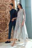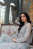 This ice blue long shirt crafted from pure silk organza is heavily ornamented with Crystal's and thread work. This luxurious outfit is finished with raw silk pants and a pearl embellished dupata for an ethereal look.