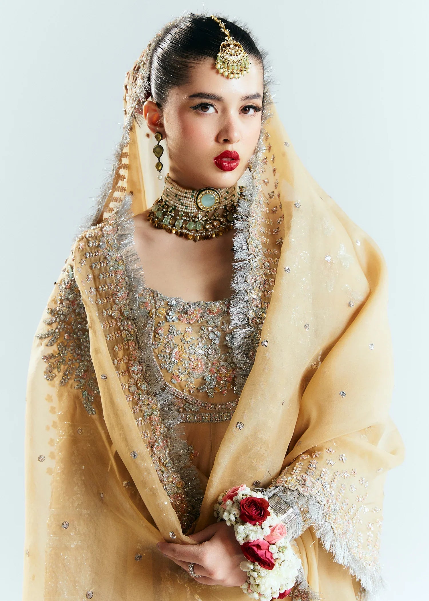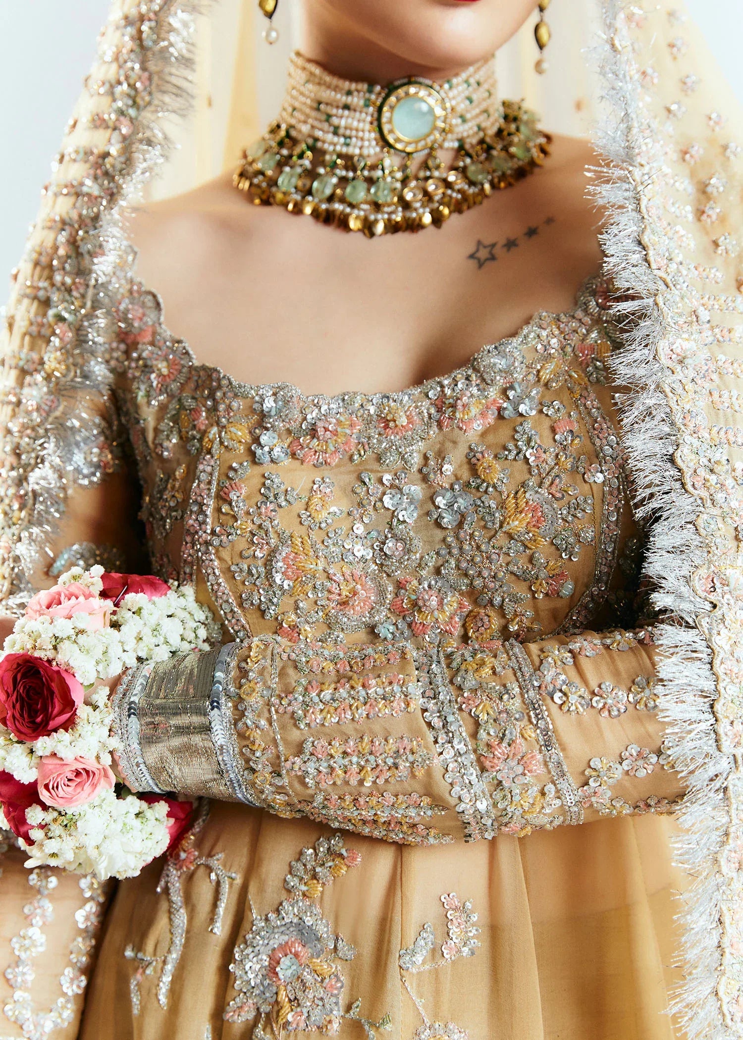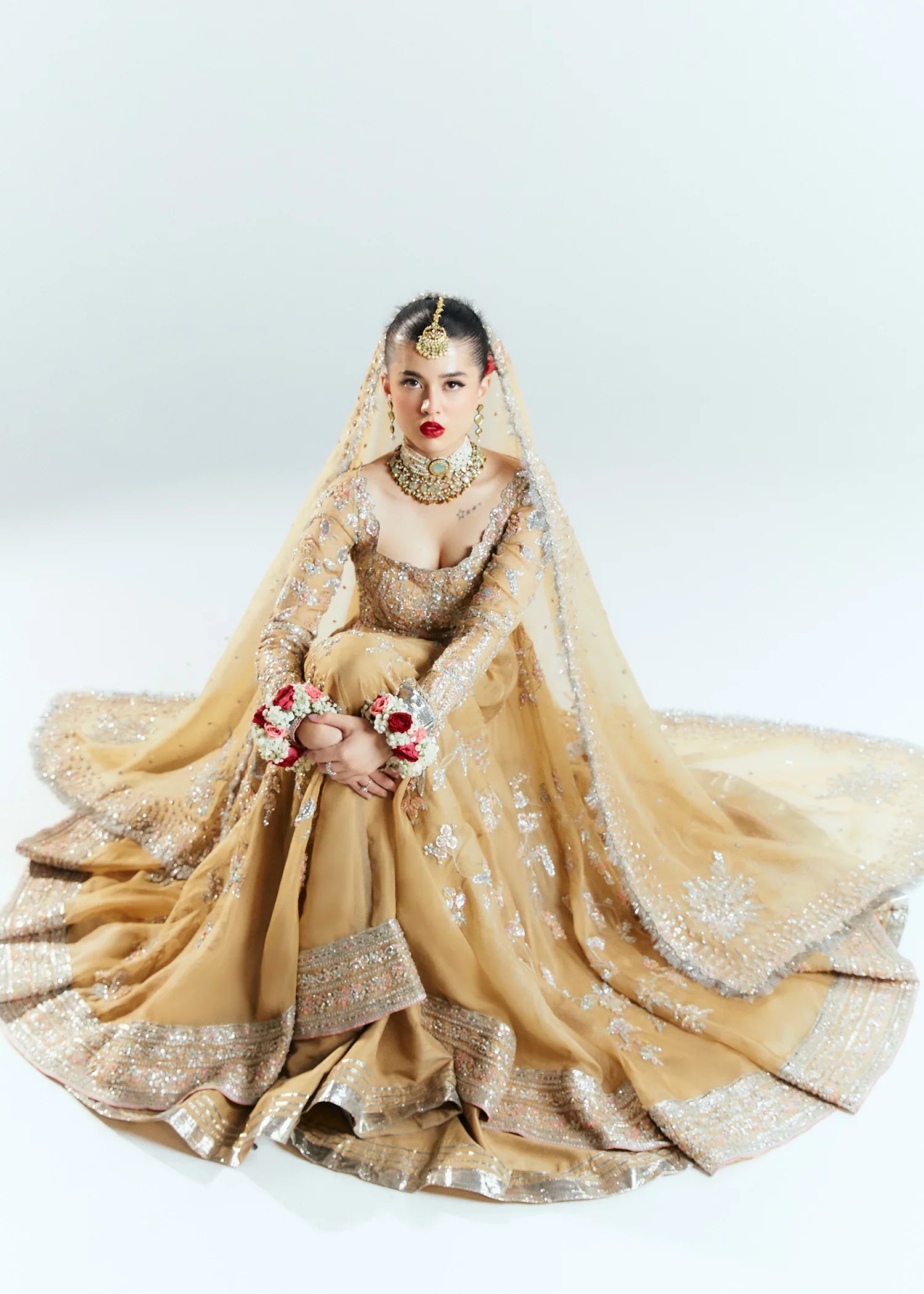 A symphony of artistry and opulence woven into every thread. Hand embellished bodice meets shimmering floral flare delicately embellished. The simple korean raw-silk lehnga sways with grace and adds the volume to the attire, while the exquisite dupatta, trimmed with kiran on four sides completes this masterpiece of regal splendour.