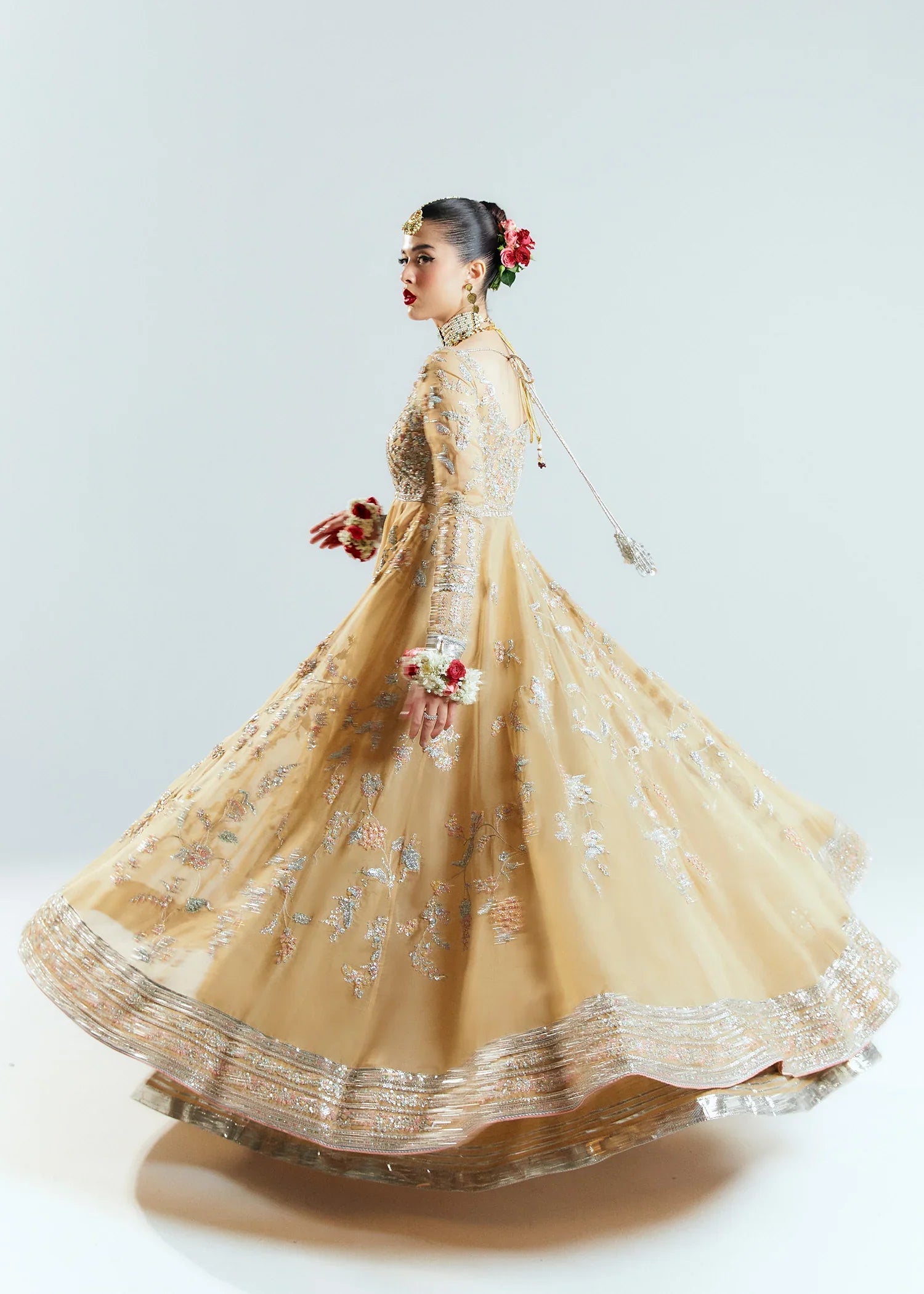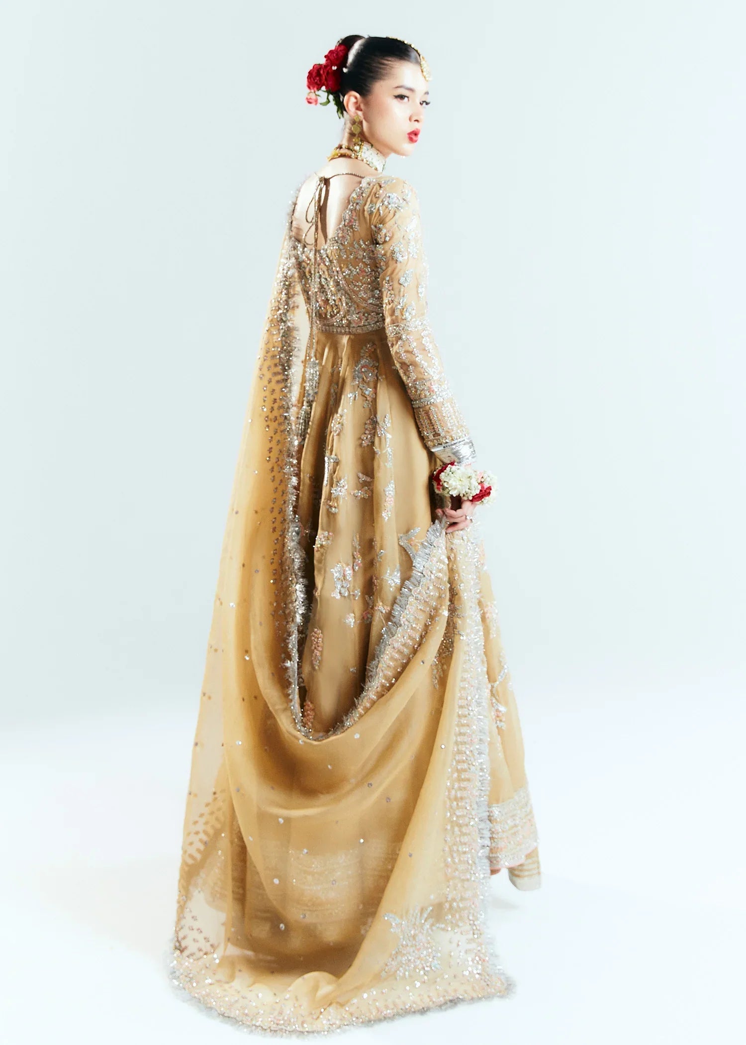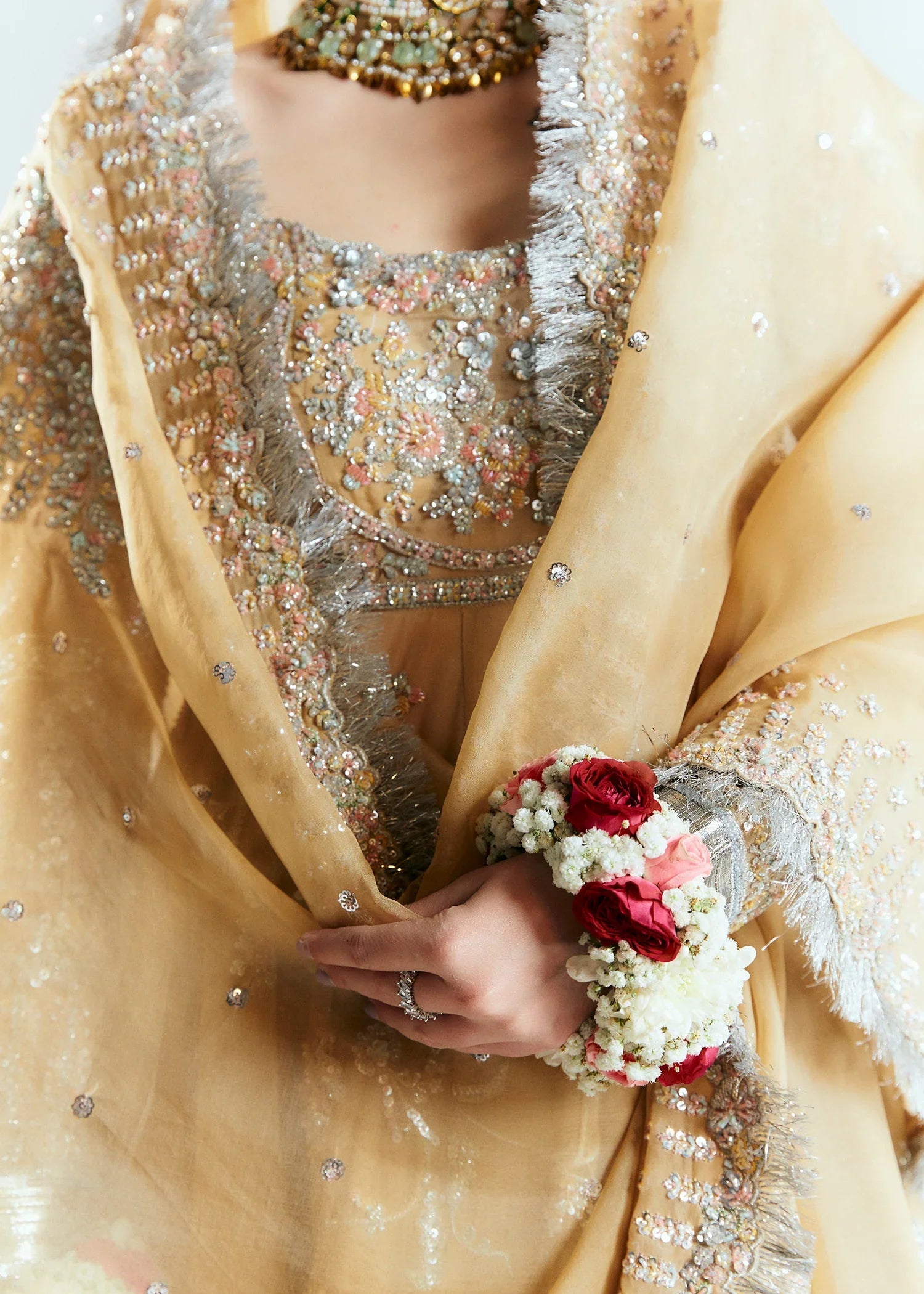 A symphony of artistry and opulence woven into every thread. Hand embellished bodice meets shimmering floral flare delicately embellished. The simple korean raw-silk lehnga sways with grace and adds the volume to the attire, while the exquisite dupatta, trimmed with kiran on four sides completes this masterpiece of regal splendour.