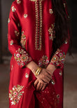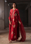 This deep red ensemble radiates timeless elegance with its rich color and intricate embellishments. The long shirt features hand-embellished floral motifs and detailed work along the neckline and cuffs, paired with straight trousers and a flowy organza dupatta. A bold yet classic choice for festive evenings or formal gatherings.