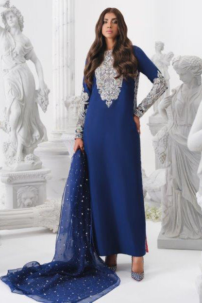 'Astral,' an obsidian, elaborately beaded pattern, includes subtle but elaborate embroidery in silver tones placed over a luscious, midnight blue canvas. Fine workmanship on the slits complements the shirt, producing the ultimate exuberance of luxury. The shirt is additionally embellished with elaborate embroidery depicting nature's starry night on the sleeves and neckline. This mesmerizing pattern combines refinement and a timelessly fascinating design sensibility when paired with an organza sequin embroidered organza dupatta.
