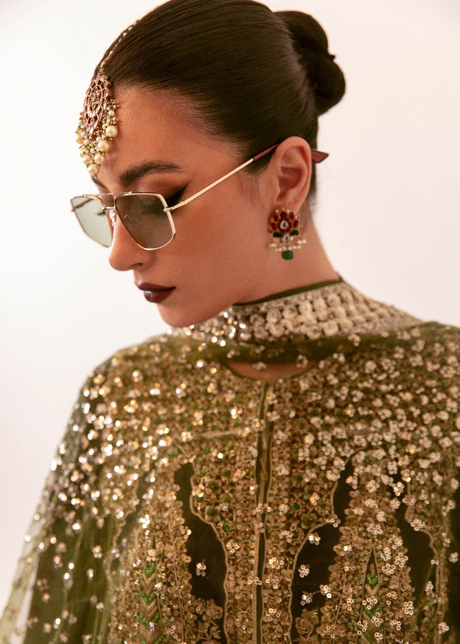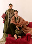 An absolute elegant raw silk black shirt with a heavily embroidered and embellished front and tassels adding to the detail and exquisitely of this fit. Its paired with chooridaar pajama and a beautiful green dupatta filled with sequin chatta and embroidered and embellished border. Pair our signature Hussain Rehar bag with it to complete this gracious outfit.