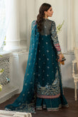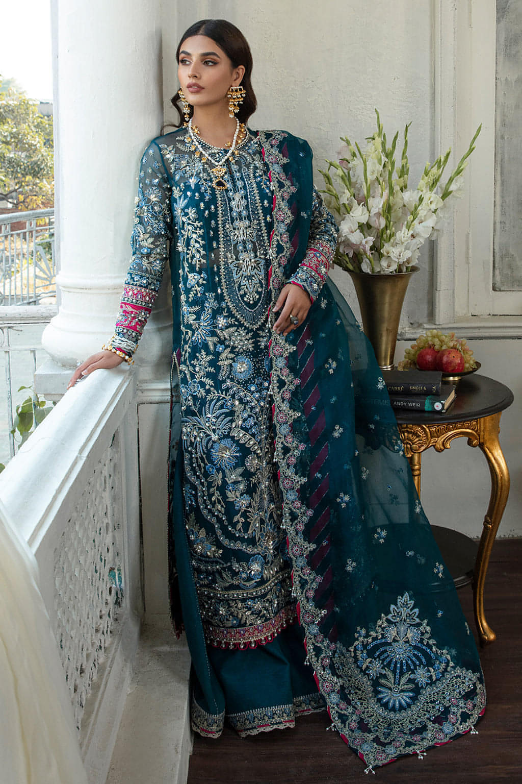 Diaanii is a gloriously curated silhouette serving festive fashion celestially with its appealing teal blue color and glinting adornments. An organza shirt and dupatta embedded with Fuschia pink hints and details of gota, crystals further fused with pearls and handwork details. Glistening silk pants are paired with it completing a quintessential festive look.