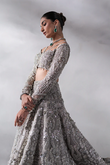 EISLEY, a symphony in grey elegance. Unveil the magic of handcrafted perfection on printed organza canvas with intricate 3D techniques and layered jewel work. The dupatta casts a celestial spell with its starry night effect, while sleeves adorned with hanging tassels add playful grace. Elevate your style with Pareesa, where every stitch is a testament to refined glamour.