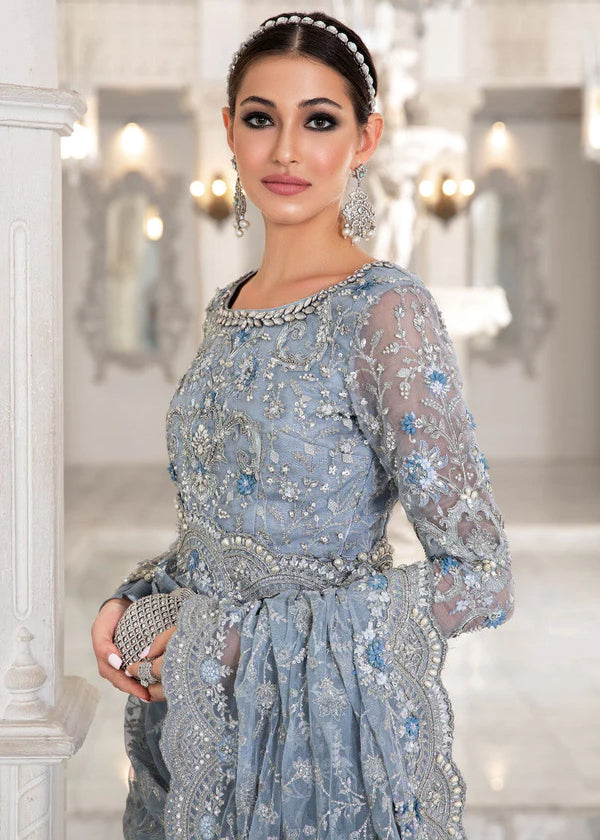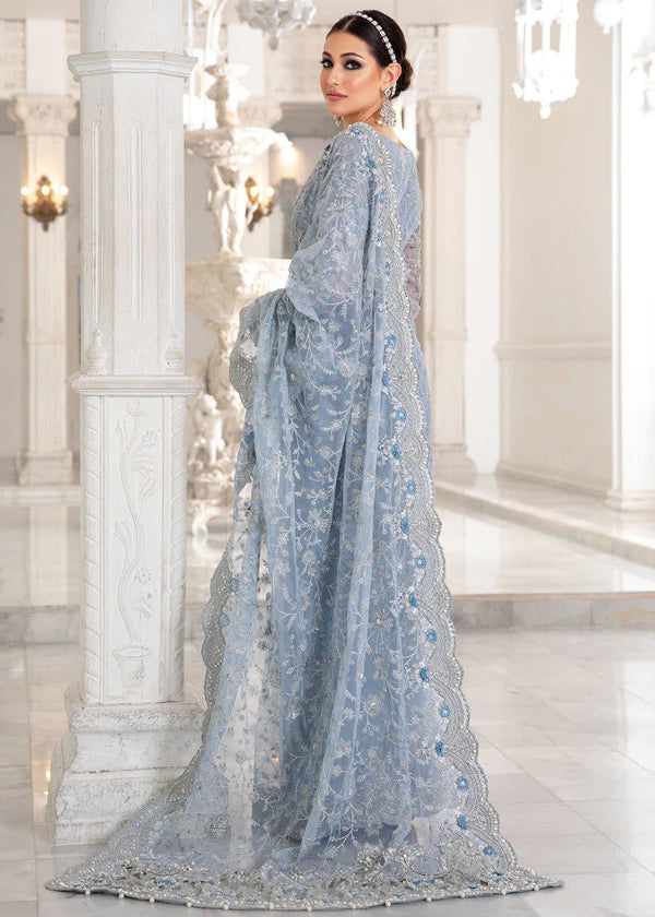 - Our Contemporary Saree Rendered In Hues Of Ice Blue With A Beaded Neckline And Embellishments Of Pearls, Diamonties, Sequins Along 3d Floral Accents And Jaal Spread With Intricate Cutwork Detailing And Pearls Finishings.