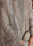 It’s a graceful grey raw silk shirt with heavily embellished front and organza sleeves. The dainty embellishments are in silver and grey pipes, sitara, cutdana, nakshi, dabka and Swarovski. It comes with a Indian Raw silk chooridaar and a gorgeous dupatta with sequin border on all 4 sides and heavy chatta of silver sitara.