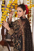 Black cotton net shirt embellished with gold n antique dabka work with hint of red resham paired with jamwar hijaar with embellished border at hem, bridal net duppata with heavy work borders on all 4 sides.