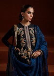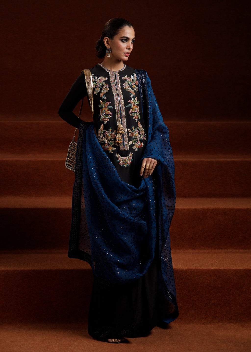 A glamourous black raw silk shirt with intricate hand work details of pink, green, tealblue, orange, gold and peach buggle beads, pink, orange, red, teal and green sequins, golden nakshi, and gold mukaish in the front of the shirt. It is paired with raw silk palazzo pants and a beautiful glitzy blue organza dupatta with black sequin and multihead borders on all four sides.
