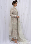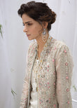 An open front, heavily embellished, floor length jacket sits above an ivory white slip and straight pants with an ice blue and candy pink embroidery panel running down the leg. The jacket is embossed with a geometrical design decorated with pearls, mirror work and hints of ice blue and candy pink seeping through intricate silver detailing. The garment is complimented with a white organza dupatta splattered with silver embroidery and an ice blue and candy pink border all around.
