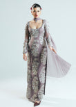Thunder-Behold this celestial dream couture piece is must have. A symphony of allure unfolds into sheer tone-on-tone silhouette, adorned with hand-sewn sequins and a modern deep neckline. Paired with Korean Rawsilk Choridar with solid chiffon dupatta embellished with sequins tassels in pallus.