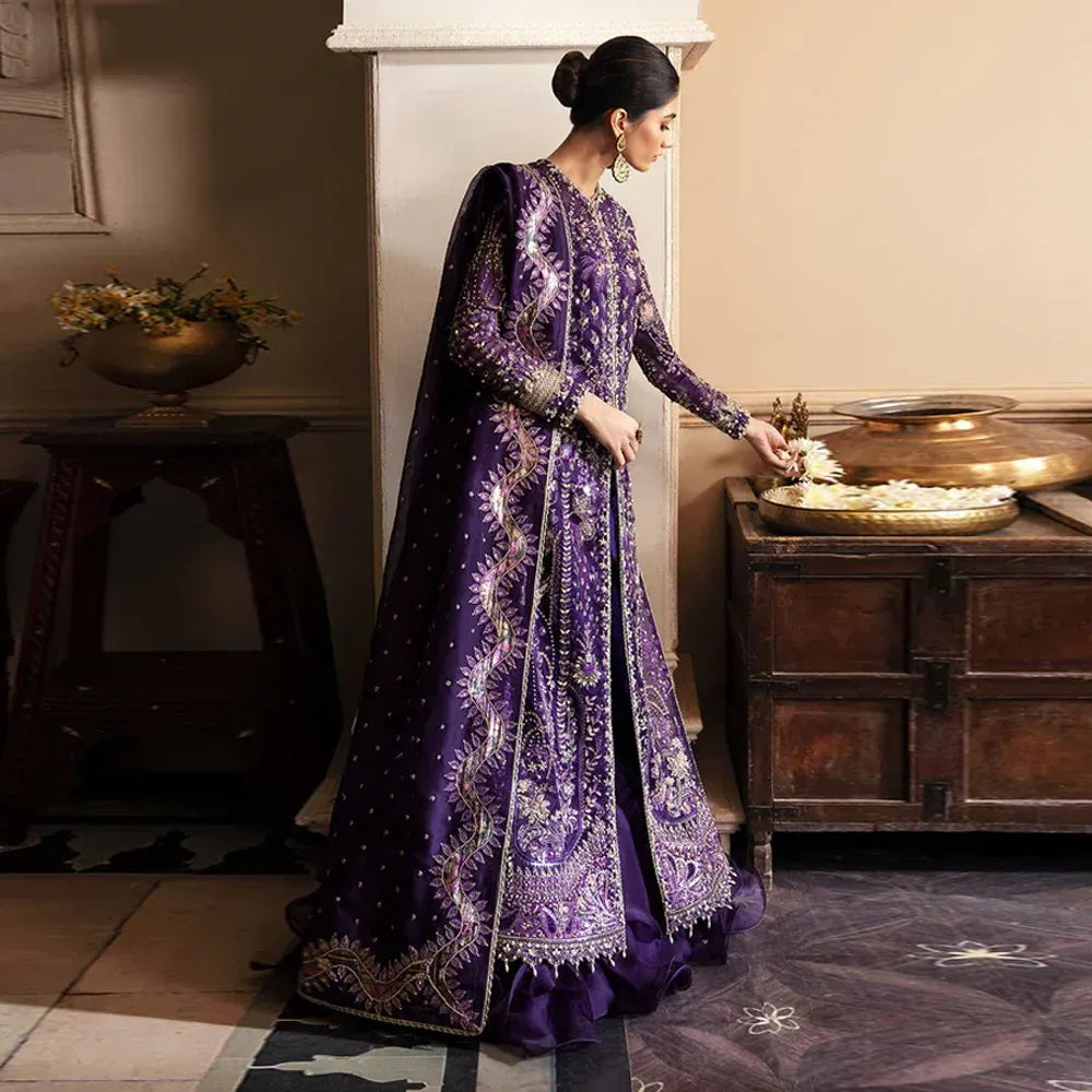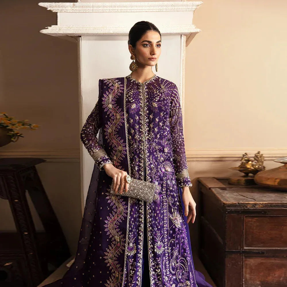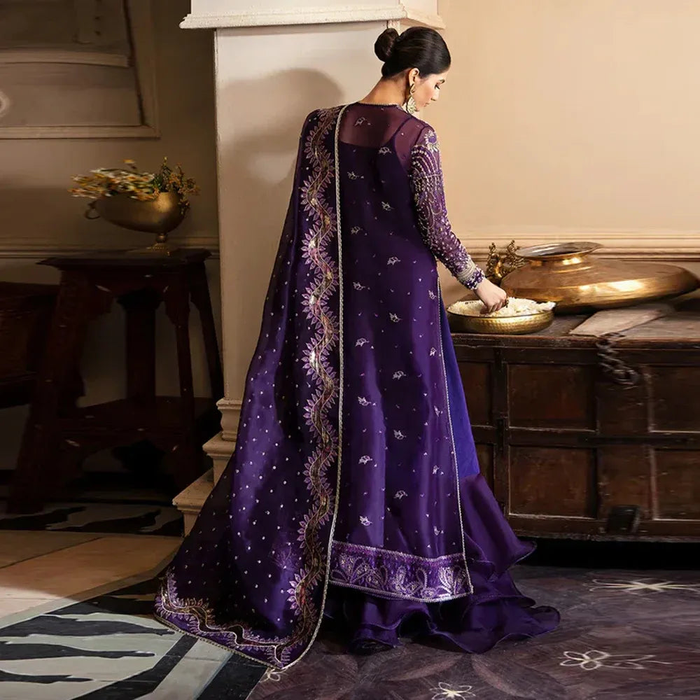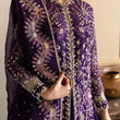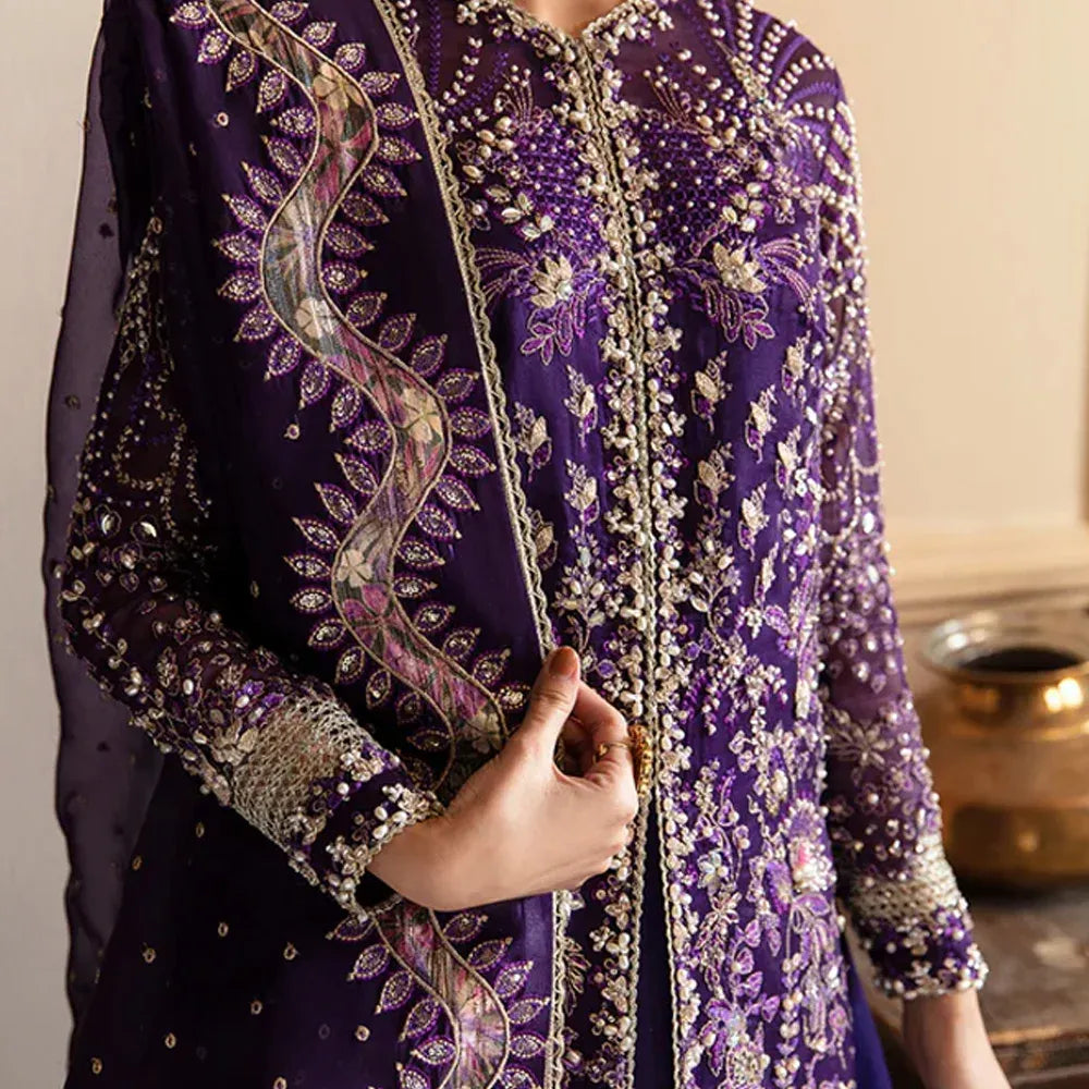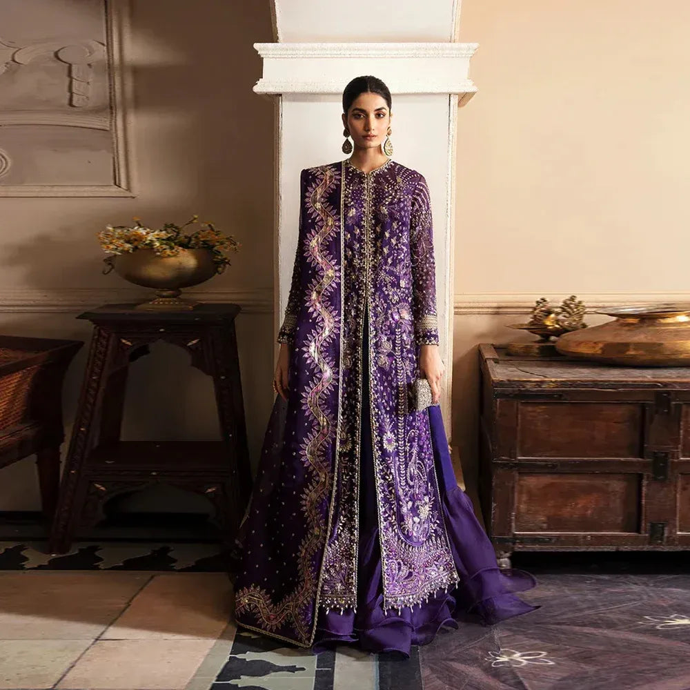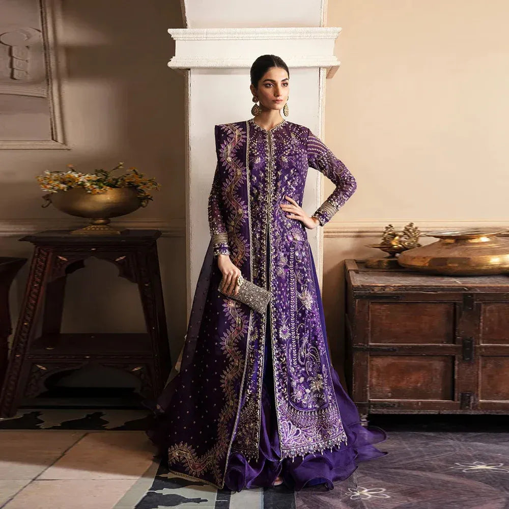 Introducing ‘SAMIRA‘ the epitome of elegance and exuberance, Our Amethyst Color Organza ensemble is a harmonious blend of intricate handwork embellishment on the jacket with the side slits and daaman feature a Tribal Pattern, adding a hint of tribal allure to the dress. Complemented by graceful allure Ruffled Organza pants, This ensemble exudes opulence and distinctive style, designed to create an overall elegant look.