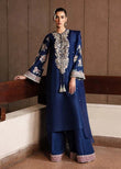 This classic navy blue raw silk long shirt has embellishment details of silver nakshi, sequins, gota, mukesh, orange, ice blue and green cut dana on neckline. The sleeves are heavily embellished with pink , orange and green sequins, cut dana and silver kiran at the hem. Its paired with red raw silk palazzo pants with borders embroidered and embellished with silver sequins, naqshi, buggle beads and pipes. The outfit contains 3 yards organza dupatta with sequin spray all over.