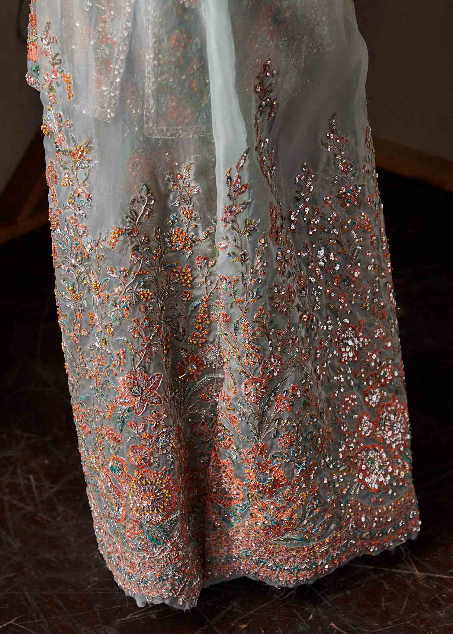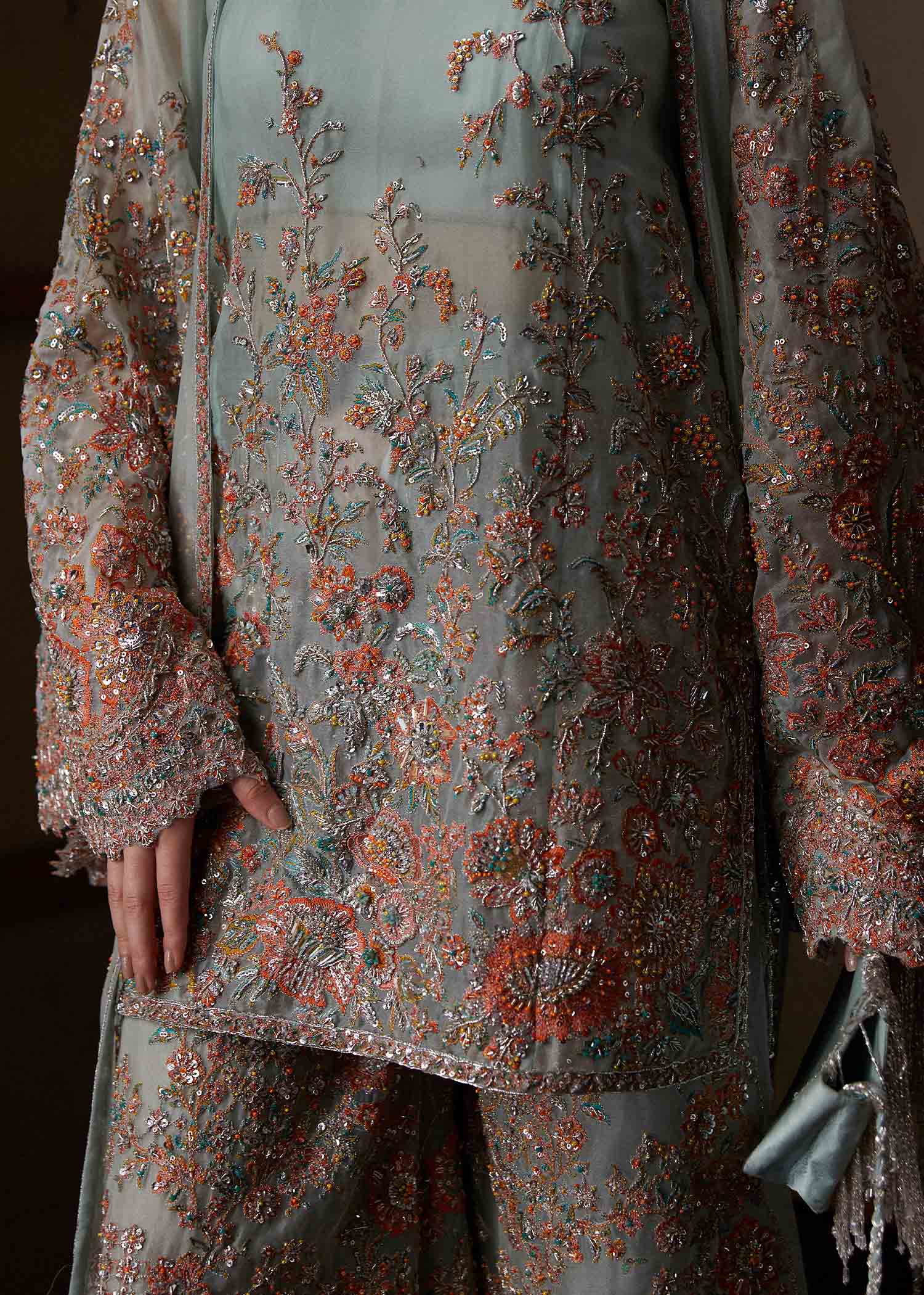 This silhouette brings a modern charm to your wardrobes with its spectrum of color blends. It features heavy embroidered trouser with intricate embelishment, paired with short length floral embroidered shirt hand embellished with sequins, naqshi, dabka and beads. To complete the look it is layered with a organza gown with flowy loose sleeves infusing this contemporary cutline.