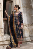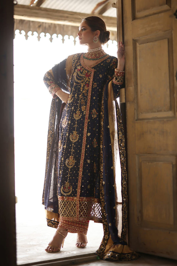 Look absolutely gorgeous in this navy angrakha! The shirt features red, green and gold flower details that adorn the neckline and body of the outfit. A heavy gold latice border anchors the shirt. The outfit is complemented by a stunning red dupatta that features dome buildings that are glistening in gold and a floral geometric pattern in the place of a sky.