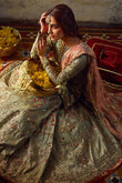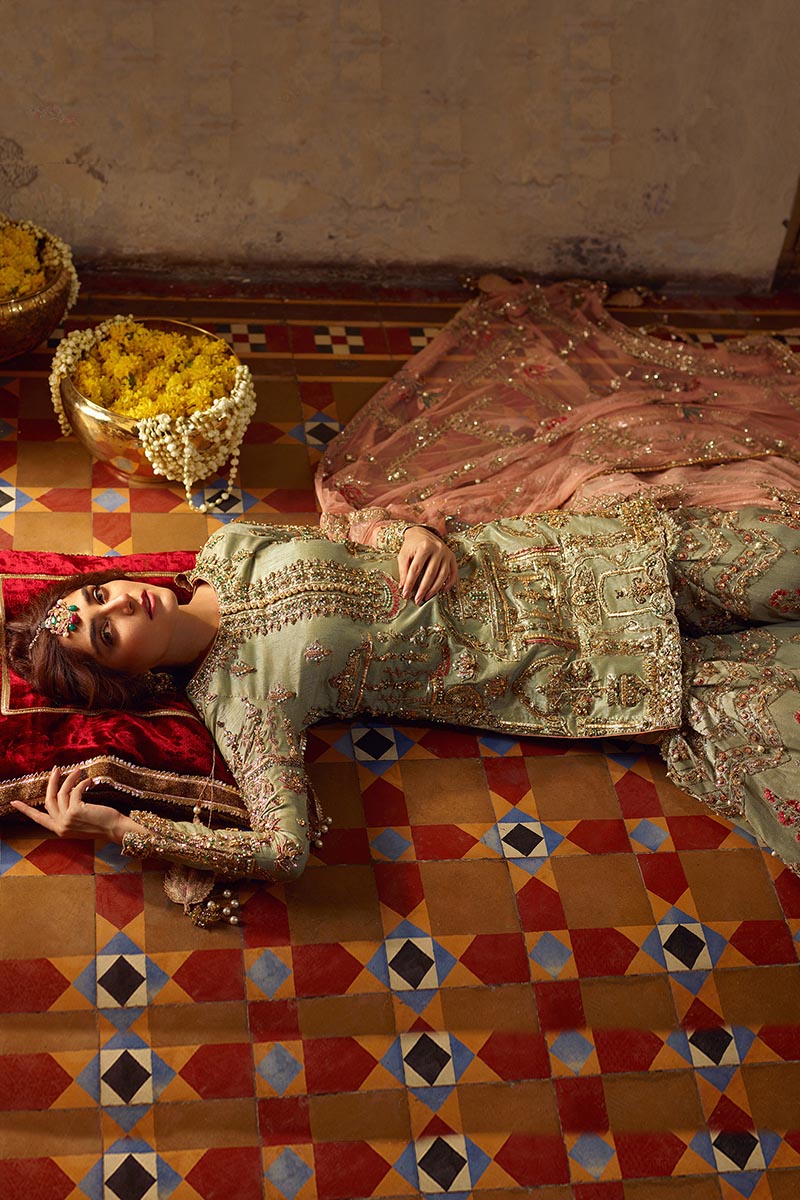 Zamarud is a 4 piece bridal consisting of a breathtaking raw silk kameez embellished using miniature flowers on a timeless kurti pattern paired with a raw silk gharara that is embellished heavily using silkfloss, zari and tilla and stones matched with a stunning heavily embellished tea pink net jaal dupatta