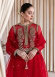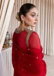 An absolutely regal red organza shirt with embellishments in the front of nakshi, dabka, sitara, and cutdana in multicolor. It comes with a satin slip. The outfit consists of red raw silk palazzo pants with pockets and an organza dupatta with dequin chatta on it.