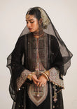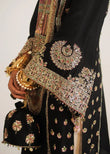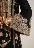 A magnificent black raw silk shirt heavily embroidered and embellished with the tinge of pink and orange cutdana, gold naqshi and dabka on neckline and boti details embellished with pink and green cutdana on side panels on front adds to the simple yet classy vibe. It comes with velvet shalwar with heavy embellishment on the border and 4 yards plain organza dupatta.